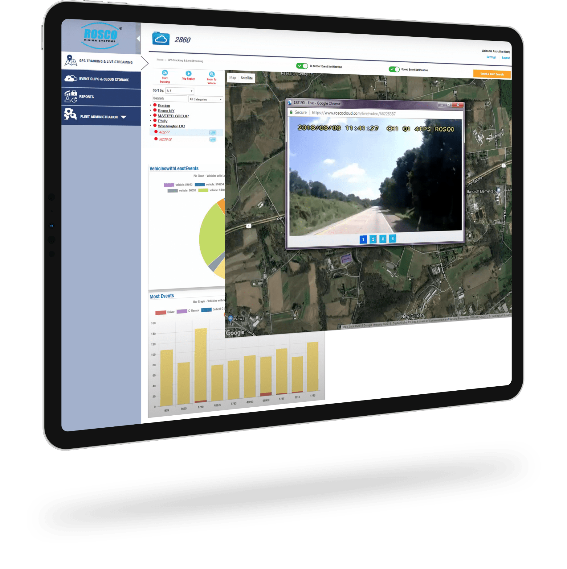 Improved user interface of RoscoLive® offers new experience with GPS tracking, live streaming video and customized reporting. See where all of your vehicles are in real time, using a single interface with full Google Maps functionality. RoscoLive allows you to watch and flag incident footage, stream video live from a vehicle, or share and download recordings.
